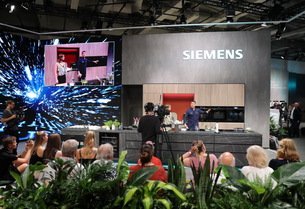 9月6日,在德国柏林国际消费电子展西门子展区,工作人员介绍新款厨电产品。新华社记者杜哲宇摄