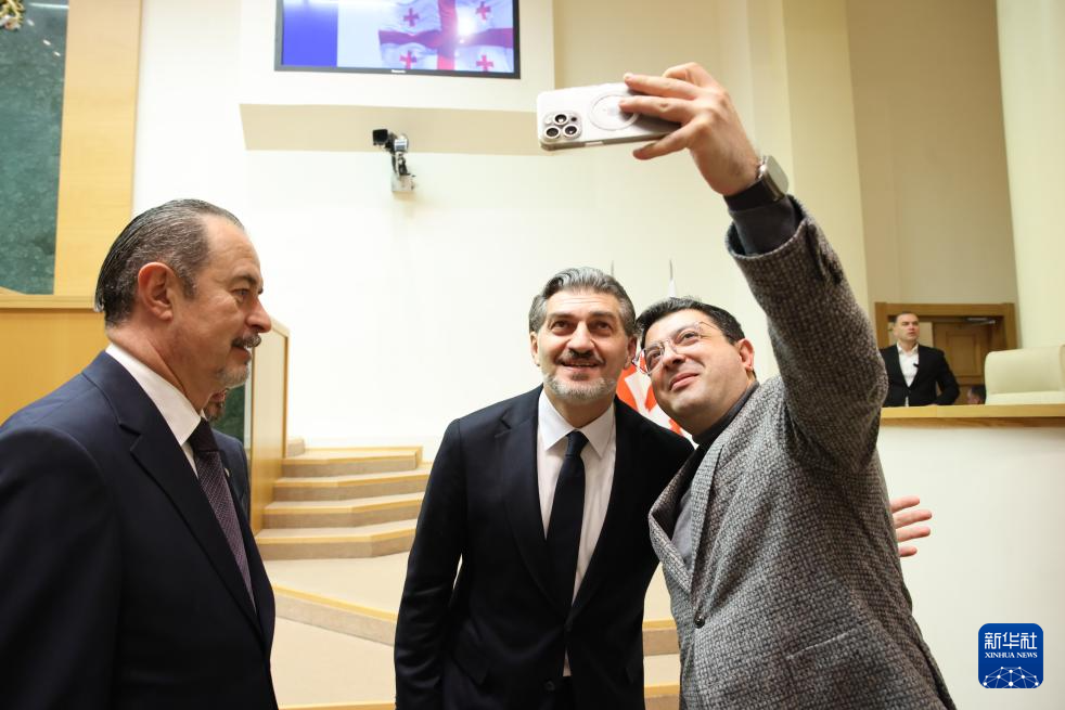 12月14日,在格鲁吉亚首都第比利斯,当选新总统的卡韦拉什维利(中)与议员代表自拍留念。新华社发(格鲁吉亚议会办公厅供图)
