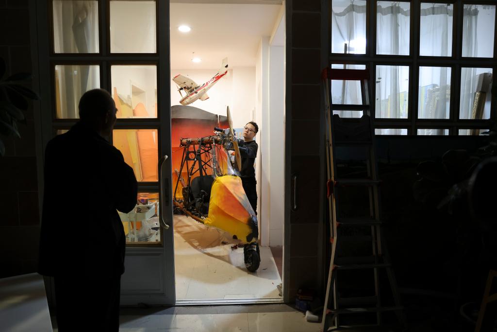 陈剑华制造的飞机完工并吊装下楼,准备送至大芬美术馆广场展示(资料照片)。新华社发(受访者供图)