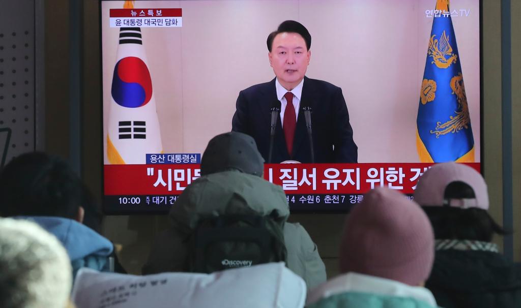 12月12日,在韩国首尔火车站,韩国民众观看总统尹锡悦对国民谈话的电视直播。新华社记者 姚琪琳 摄