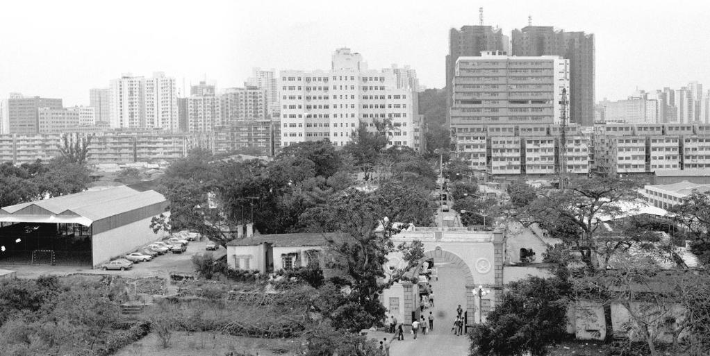 1987年在广东省珠海市拱北口岸眺望澳门的楼群。