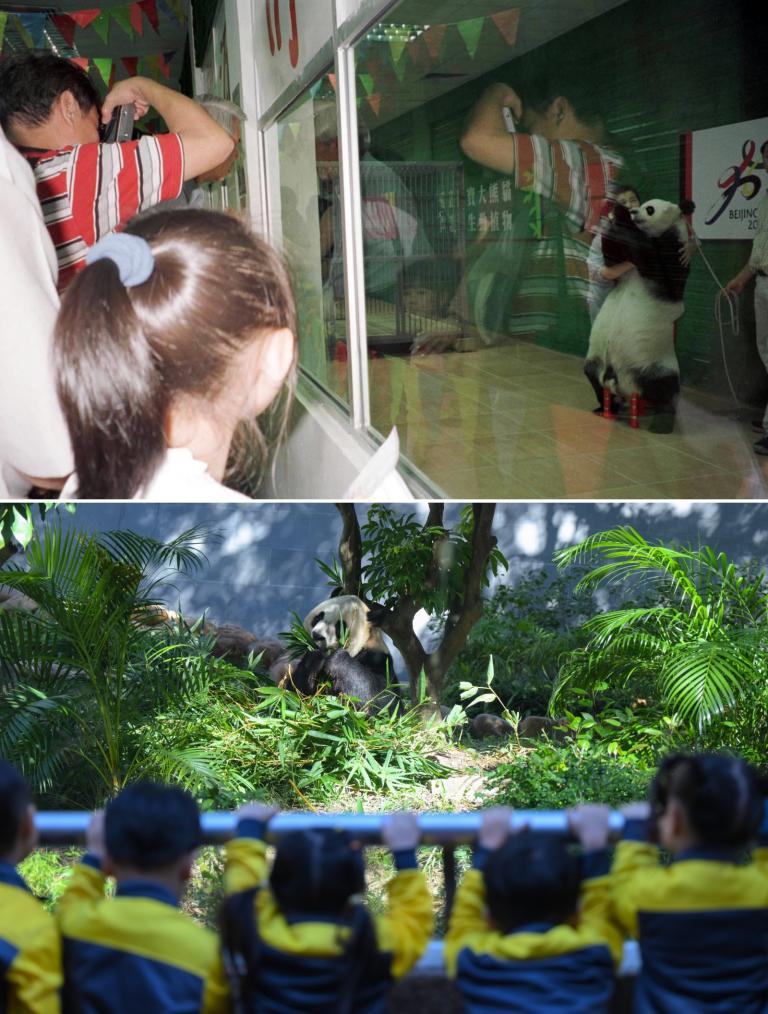 上图:2001年5月,大熊猫“英英”在澳门国际商贸城亮相,众多澳门市民争睹其风采,这是国宝大熊猫首次在澳门亮相;下图:2024年11月29日,澳门幼儿园学生在石排湾郊野公园大熊猫馆观看大熊猫。