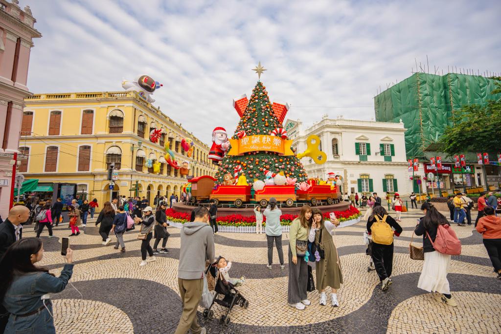 12月12日,游客在澳门议事亭前地的圣诞树前拍照。新华社记者 朱炜 摄