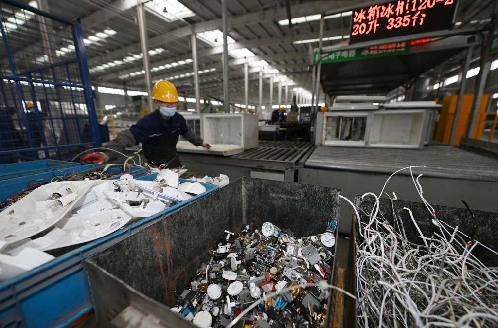 天津一家正规家电拆解企业工作人员在冰箱拆解线分拣拆解后的部件(10月22日摄)。