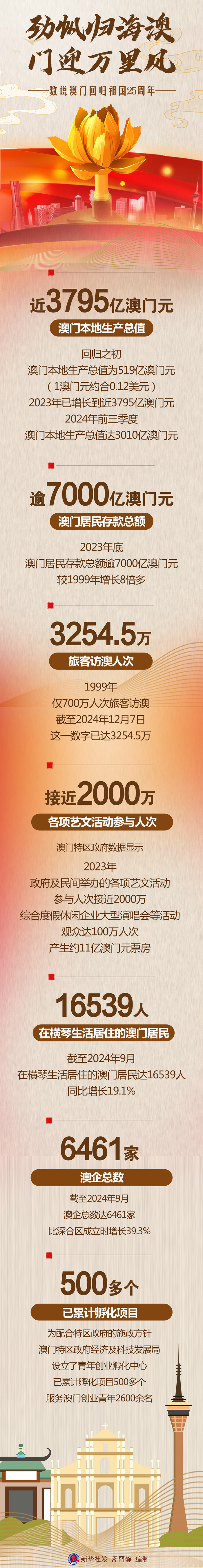 回归祖国25年来,在“一国两制”方针指引下,在中央政府和祖国内地的大力支持下,澳门实现向现代化国际都市的华丽转身。澳门特别行政区政府与社会各界携手并进,积极探索适合自身的发展路径,在经济、民生等领域取得显著成就。 新华社发 孟丽静 编制