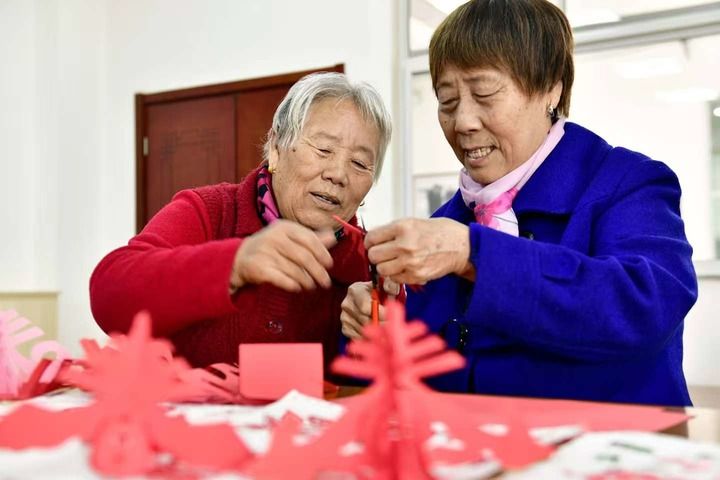 在山东省滨州市博兴县博华老年公寓文体活动室,老人们在剪纸。新华社记者 郭绪雷 摄