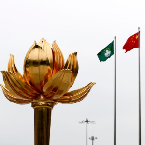 图为在澳门金莲花广场拍摄的“盛世莲花”雕塑(2024年11月21日摄)。新华社记者王益亮摄