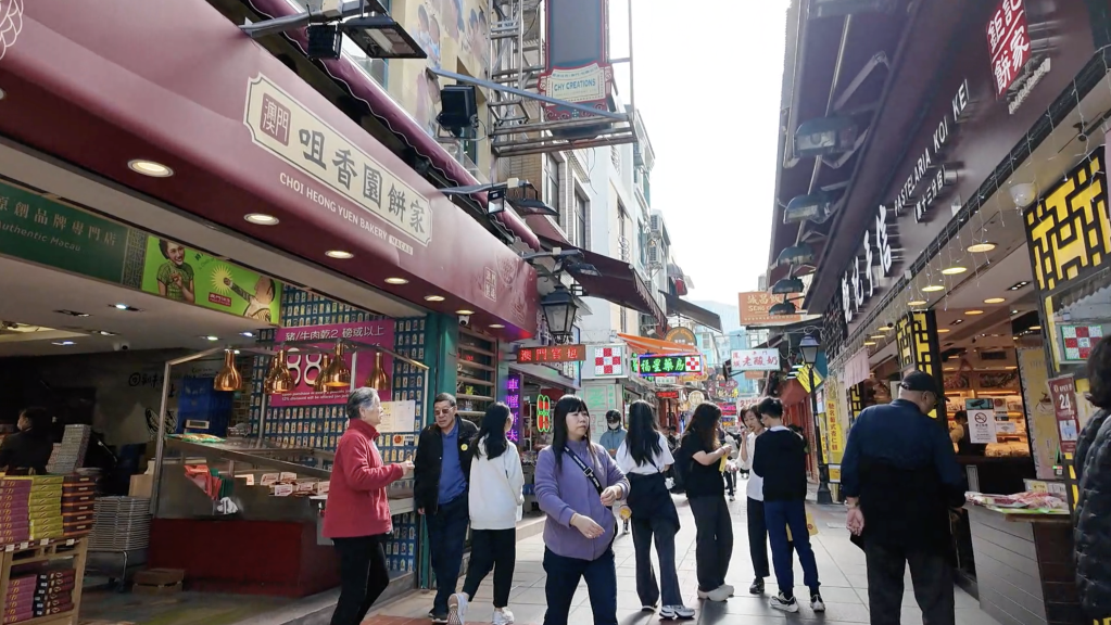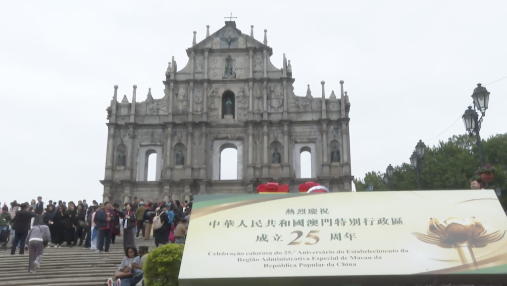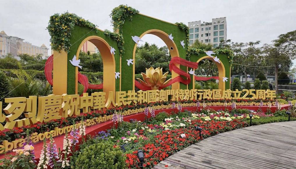 12月的澳门街头,处处洋溢着节日喜庆气氛。在议事亭前地的板樟堂街,国旗和区旗交相辉映;大三巴牌坊前立起庆祝澳门回归祖国25周年的招牌;“回归的旋律”主题花展前游人如织;氹仔旧城区的重要组成街道之一官也街更添喜庆与热闹。