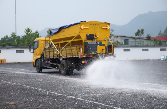 演练现场融雪剂撒布车作业。
