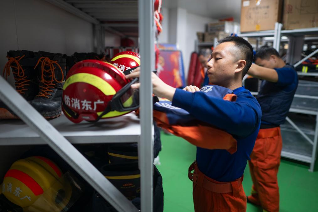 12月16日,东澳岛专职消防救援站消防员穿戴消防救援服。