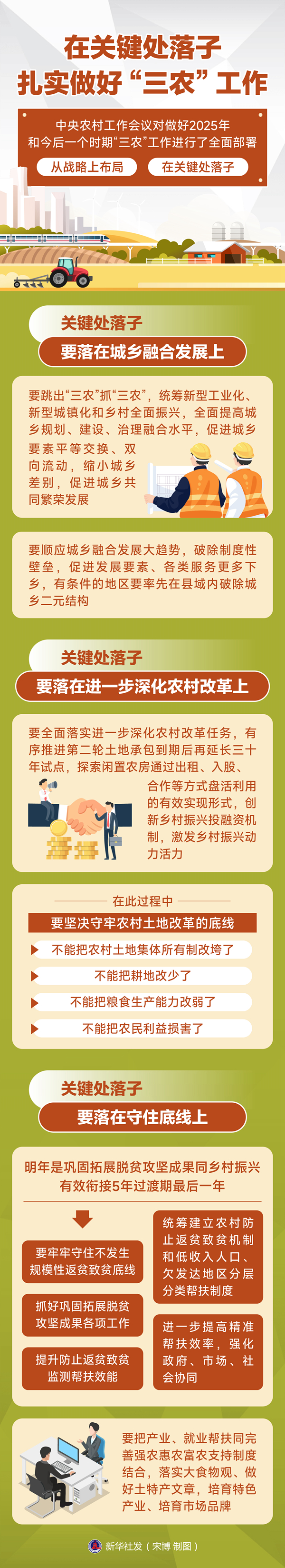 中央农村工作会议对做好2025年和今后一个时期“三农”工作进行了全面部署。做好“三农”工作,要以习近平总书记重要指示精神为根本遵循,从战略上布局、在关键处落子,坚持城乡融合发展,进一步深化农村改革,完善强农惠农富农支持制度,扎实推进乡村全面振兴。