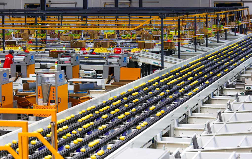 四川省维记农业集团有限公司车间内,多功能六通道智能分选机在分拣柠檬。新华社发