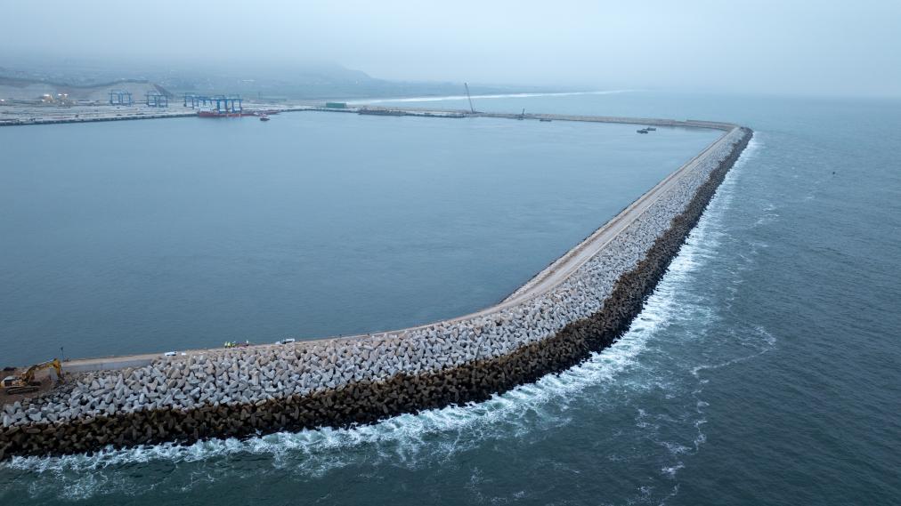 钱凯港位于秘鲁首都利马以北80公里的钱凯湾内,是中秘共建“一带一路”重点项目。港口服务范围覆盖农产品、工业原料、机械设备等多个领域。从空中俯瞰,约2.6公里长的防波堤像巨臂一般环抱住码头设施,以阻挡太平洋海浪的侵蚀。