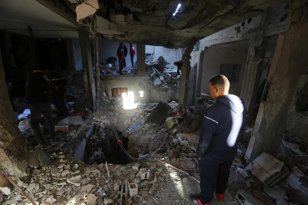 12月16日,在加沙地带中部努赛赖特难民营,人们查看以军袭击后的建筑废墟。新华社发(里泽克·阿卜杜勒贾瓦德摄)