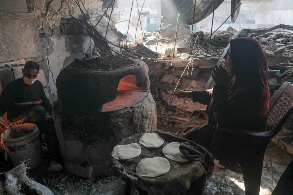 12月15日,在加沙地带中部城市代尔拜拉赫,巴勒斯坦人在被毁坏的房屋中烤制大饼。新华社发(里泽克·阿卜杜勒贾瓦德摄)