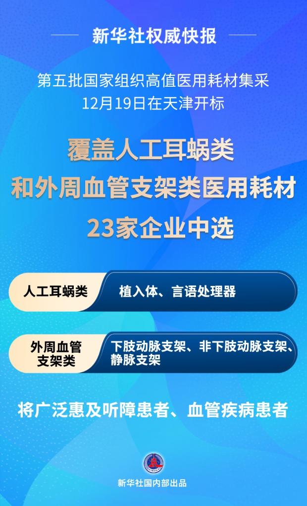 此次集采覆盖人工耳蜗类、外周血管支架类医用耗材,23家企业中选。其中人工耳蜗类中选产品包括植入体和言语处理器,外周血管支架类中选产品包括下肢动脉支架、非下肢动脉支架、静脉支架,将广泛惠及听障患者和血管疾病患者。