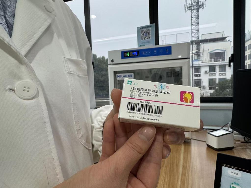 浙江省杭州市西湖区文新街道社区卫生服务中心疫苗接种医务人员展示一款脑膜炎球菌多糖疫苗。新华社记者 顾天成 摄