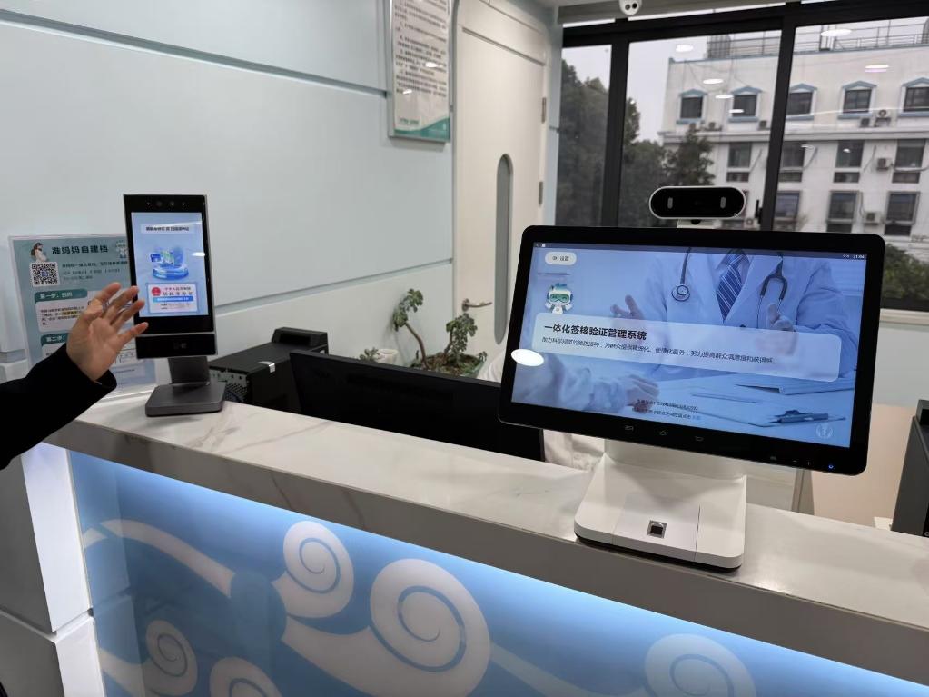 浙江省杭州市西湖区文新街道社区卫生服务中心接种门诊服务台一体化签核验证系统。新华社记者 顾天成 摄