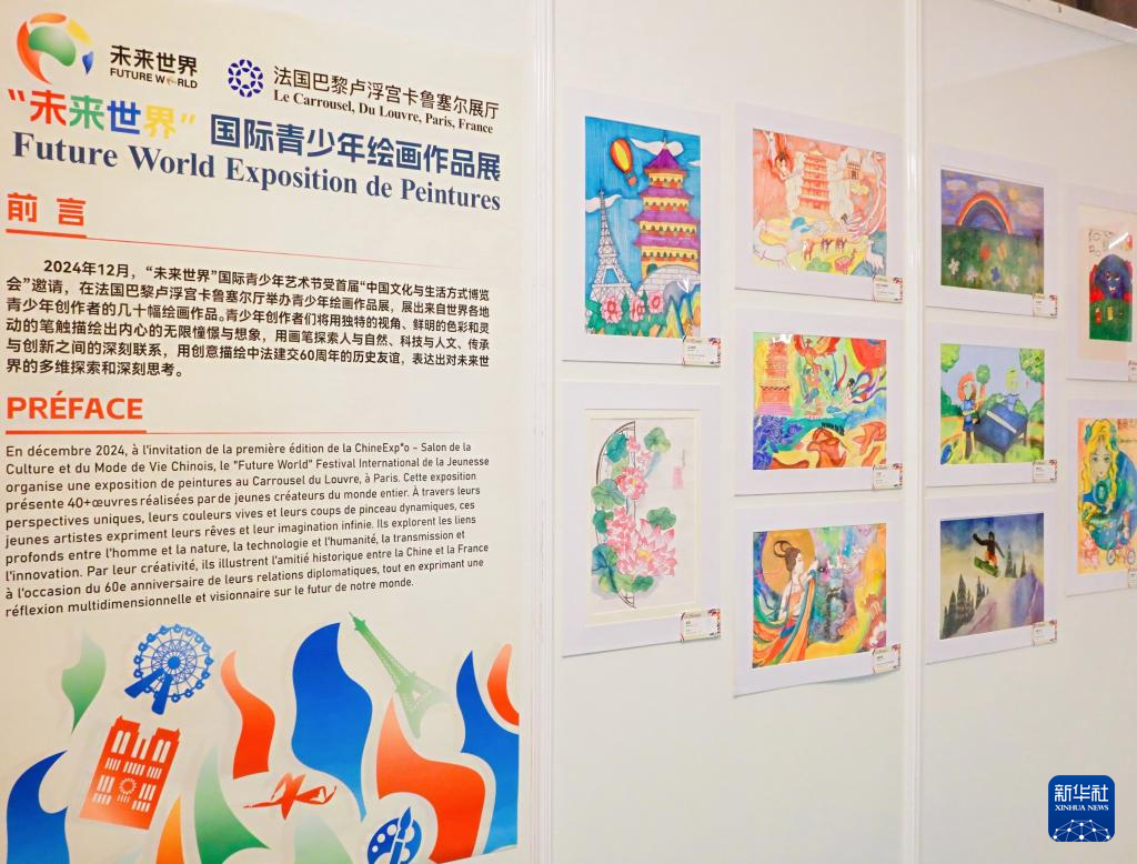 这是12月20日在法国巴黎卢浮宫拍摄的“未来世界”国际青少年绘画展展板。新华社发(五洲传播中心供图)