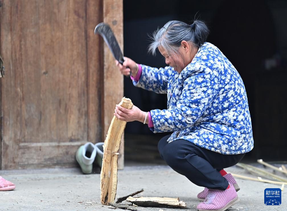 在广西柳州市融安县大将镇龙妙村龙妙屯,村民在自家门前劈柴(12月17日摄)。
