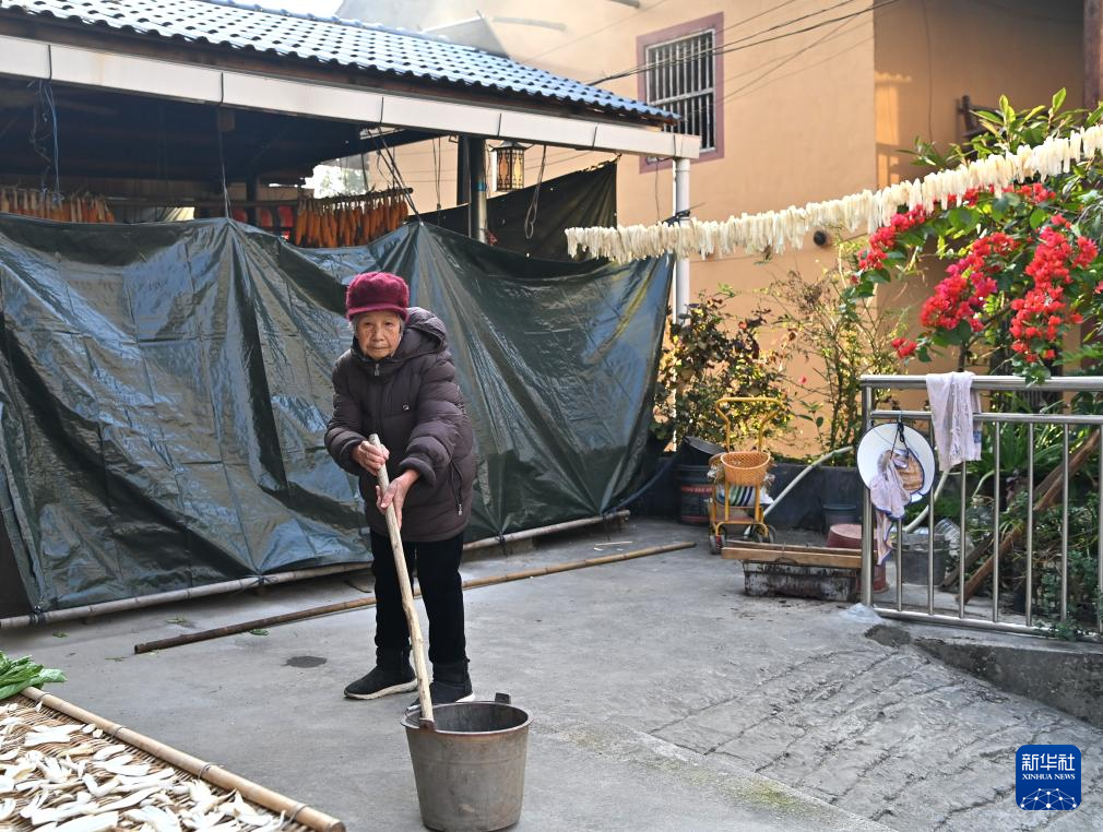 在广西柳州市融安县大将镇龙妙村龙妙屯,一名村民在整理自家庭院(12月18日摄)。