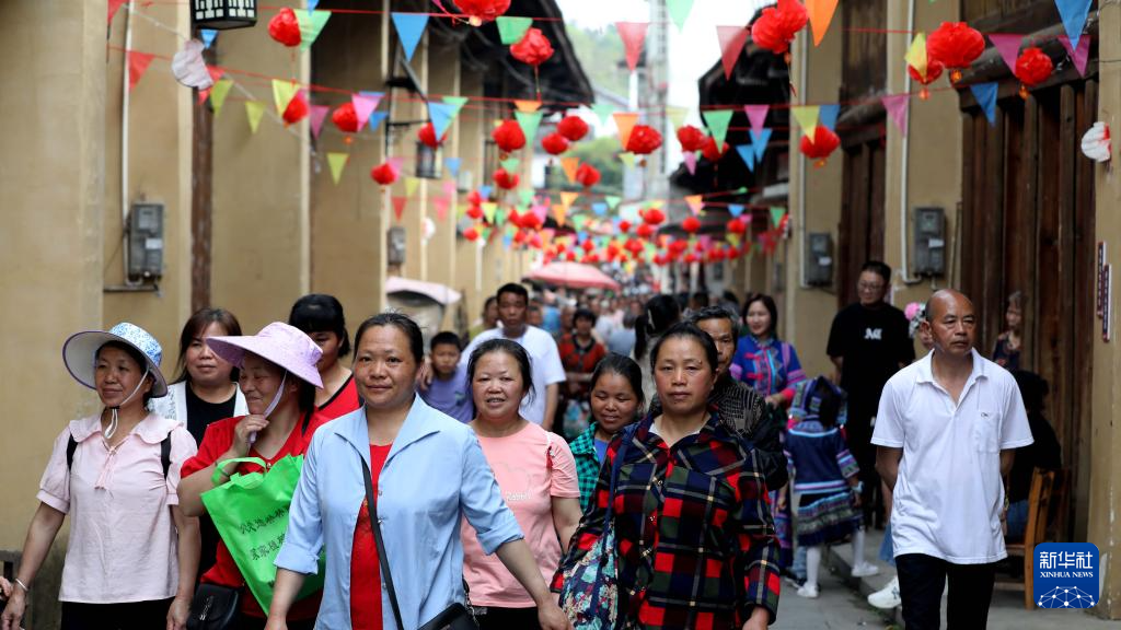 在广西柳州市融安县大将镇龙妙村,人们行走在百年老街上(3月25日摄)。