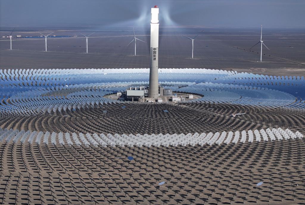 这是2024年9月12日在新疆哈密市伊吾县淖毛湖镇拍摄的国家光热示范项目——熔盐塔式50兆瓦光热发电站(无人机照片)。新华社记者 胡虎虎 摄