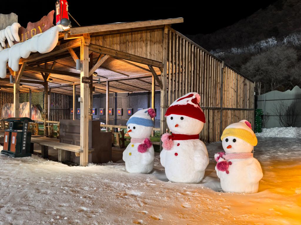 在沈阳东北亚滑雪场,游客不仅可以滑雪,还可以与数米高的冰冻玫瑰墙合影打卡,在冰雪城堡里玩冰滑梯,在造型不一的雪屋里尝一杯冻梨美式、冻梨特调。