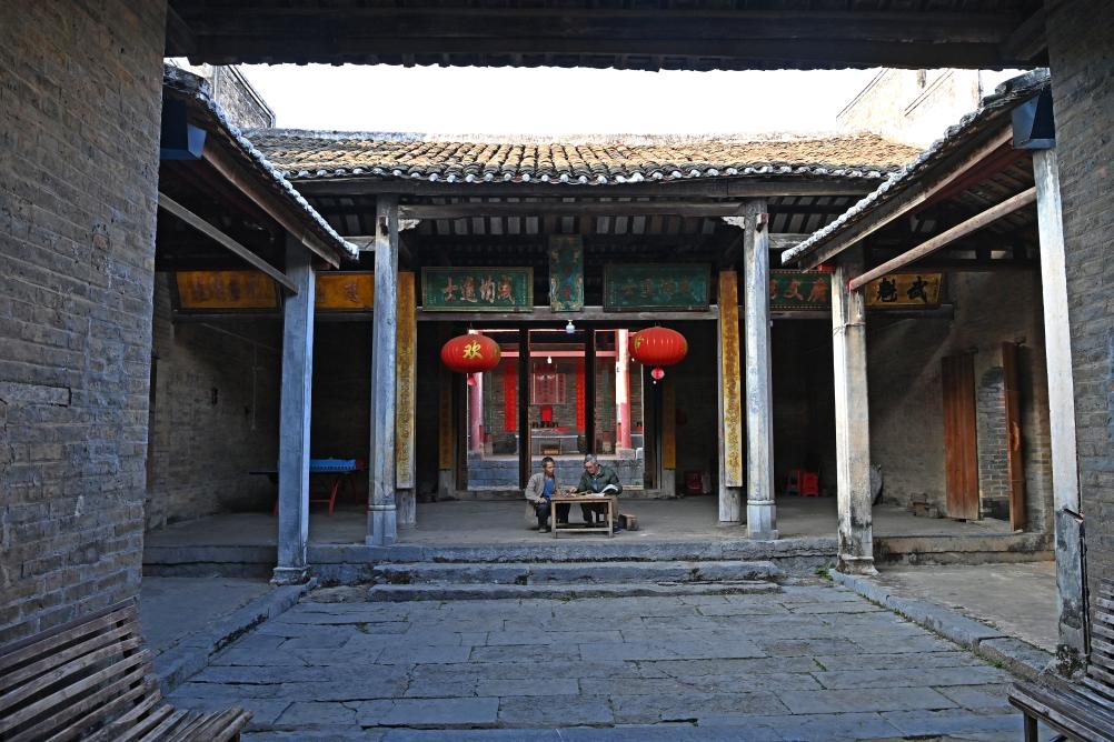 村民行走在广西来宾市金秀瑶族自治县桐木镇那安村龙腾屯的古建筑群里(12月18日摄)。