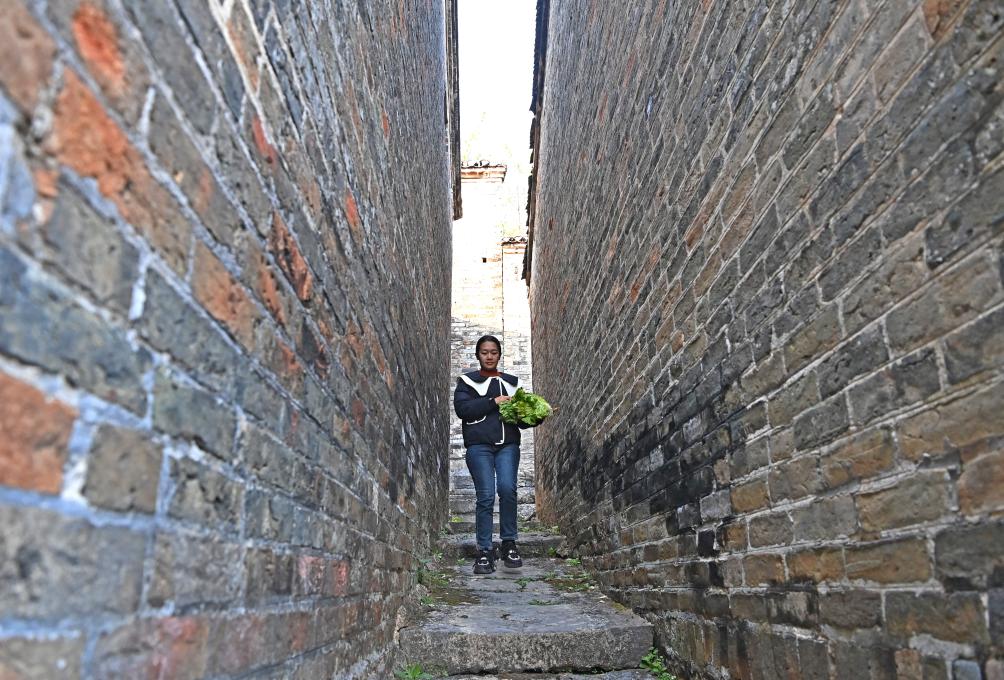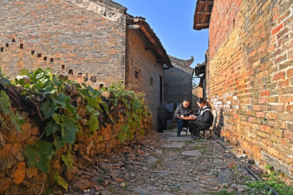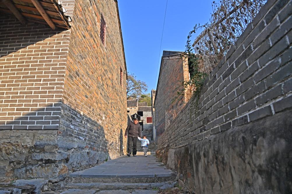 村民行走在广西来宾市金秀瑶族自治县桐木镇那安村龙腾屯的古巷里(12月19日摄)。