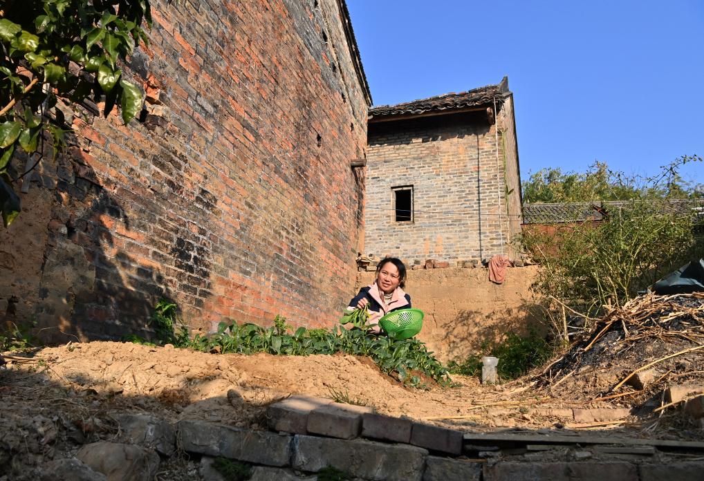 村民在广西来宾市金秀瑶族自治县桐木镇那安村龙腾屯菜地里摘菜(12月19日摄)。