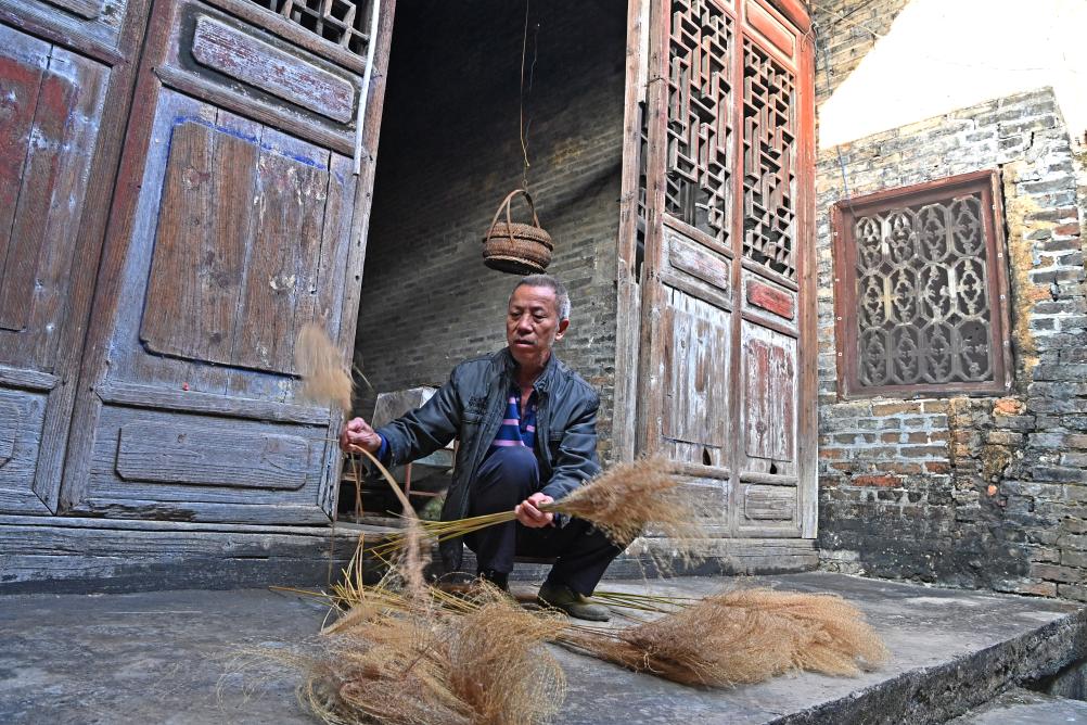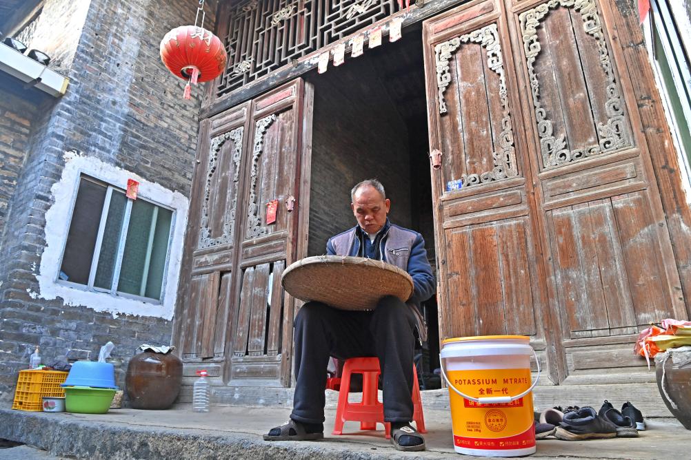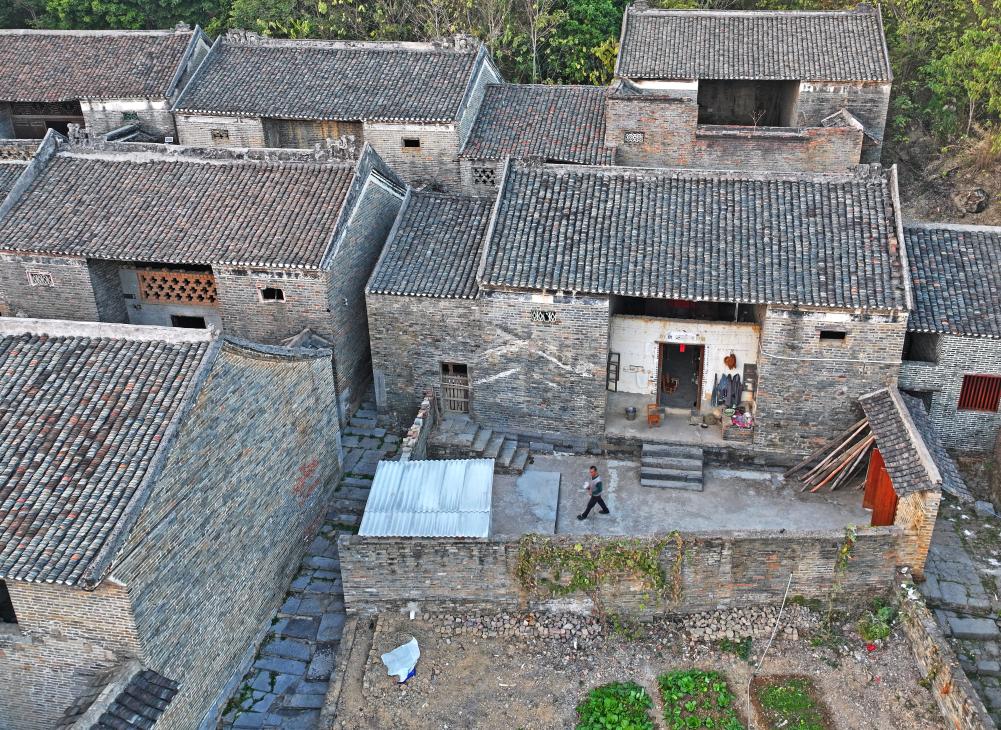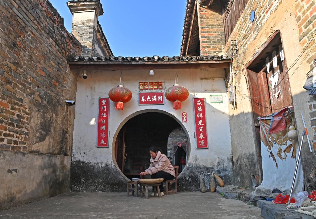 村民从广西来宾市金秀瑶族自治县桐木镇那安村龙腾屯一座古宅里走出(12月19日摄)。
