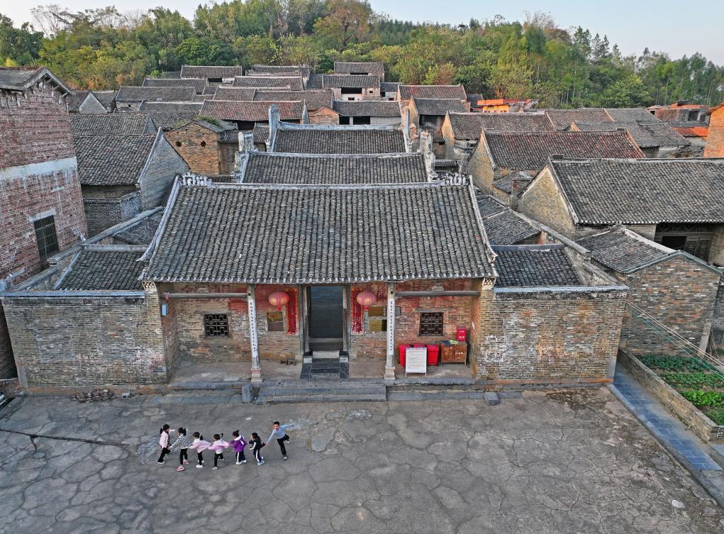 孩子们在广西来宾市金秀瑶族自治县桐木镇那安村龙腾屯玩耍(12月18日摄,无人机照片)。