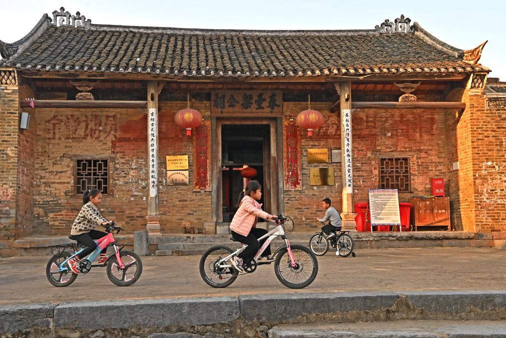 几名孩子在广西来宾市金秀瑶族自治县桐木镇那安村龙腾屯骑自行车(12月18日摄)。