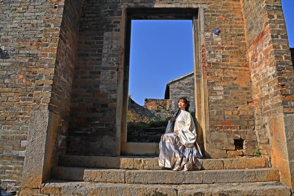 一名游客在广西来宾市金秀瑶族自治县桐木镇那安村龙腾屯的古宅里打卡(12月19日摄)。