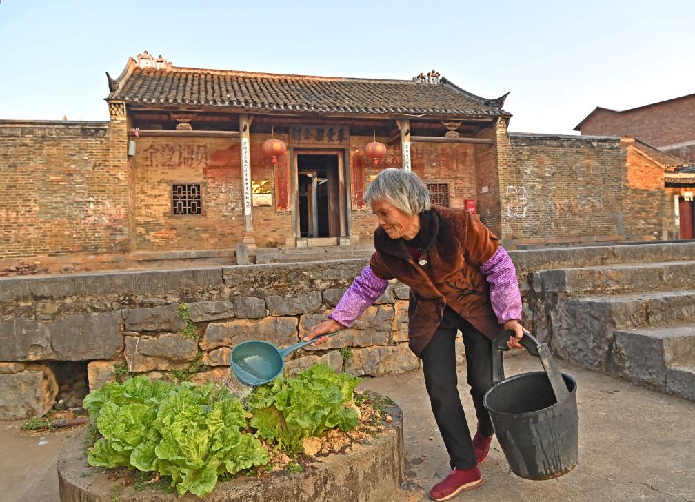 村民在广西来宾市金秀瑶族自治县桐木镇那安村龙腾屯给蔬菜浇水(12月19日摄)。