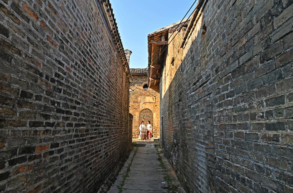 两名游客行走在广西来宾市金秀瑶族自治县桐木镇那安村龙腾屯的古巷里(12月19日摄)。