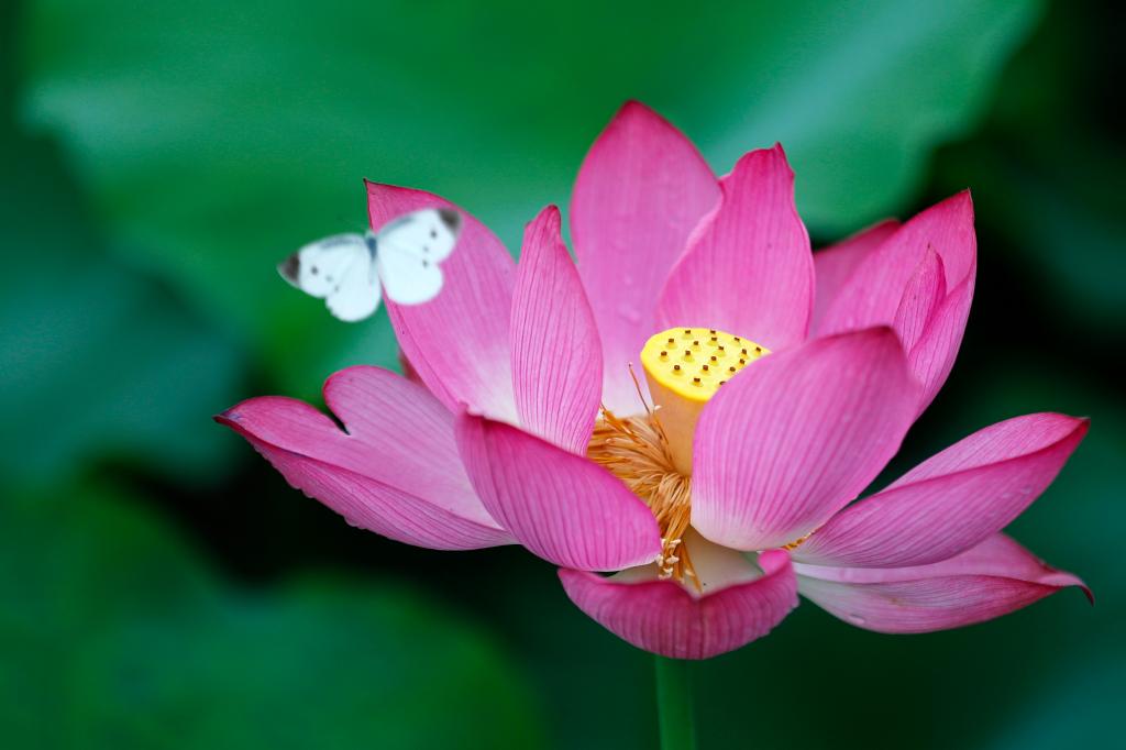 黄山市徽州区潜口镇东山村,蝴蝶在荷花间飞舞(7月2日摄)。