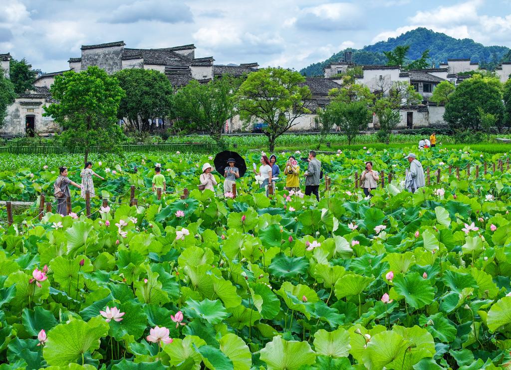 夏日的徽州,湖面上荷花亭亭玉立,与白墙黑瓦的徽派建筑相映成趣,构成了一幅幅生动的图景。