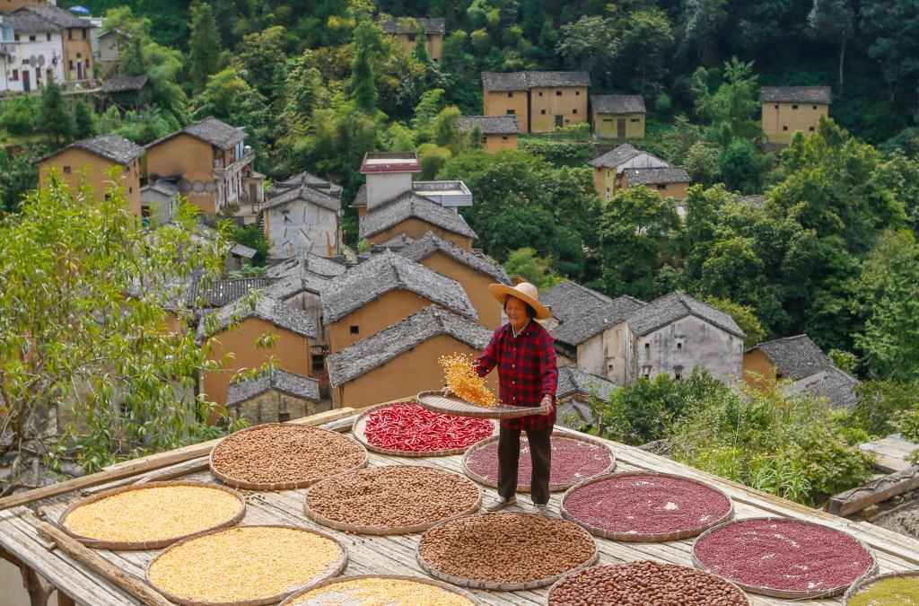 黄山市歙县阳产村,村民在土楼前晾晒农作物(9月22日摄)。