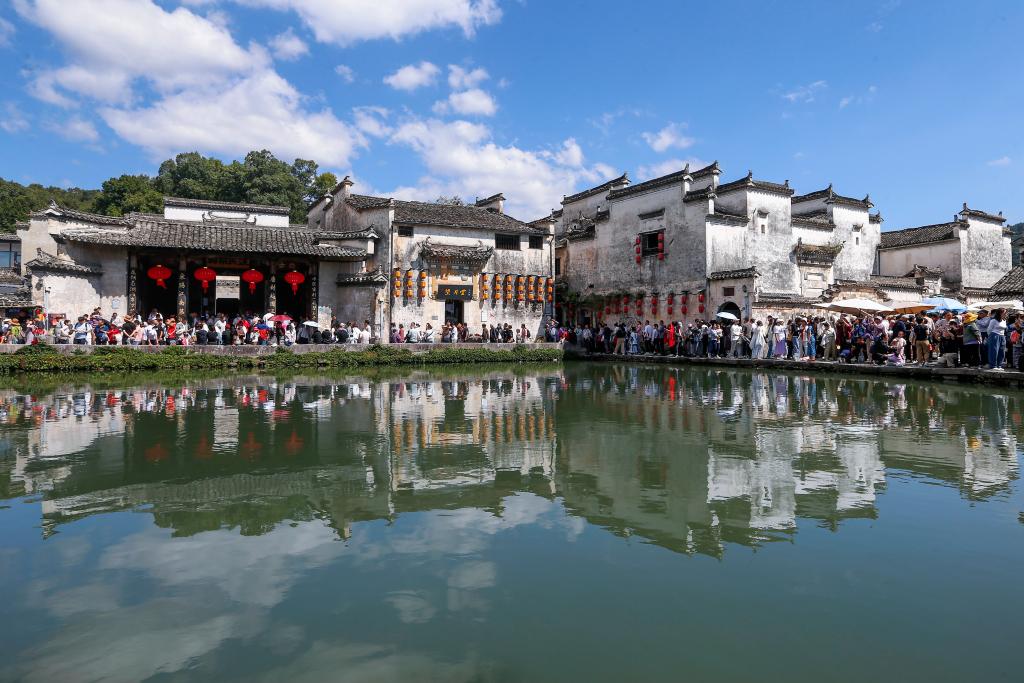 人们在黄山市黟县宏村月沼旁的汪氏宗祠外游览(10月3日摄)。
