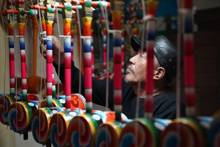 在四川省甘孜藏族自治州巴塘县,王扎西在家中整理弦胡。王扎西是“巴塘弦子舞”的省级非遗传承人(11月5日摄)。