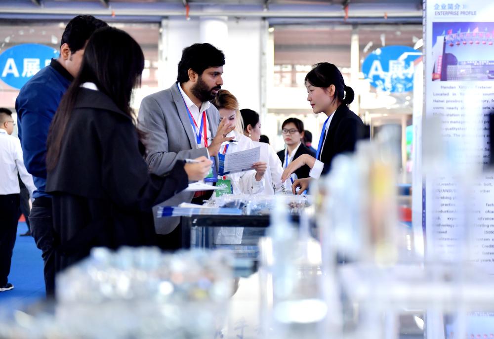 2024年10月10日,采购商(中)在2024年中国·永年紧固件基地国际采购大会现场了解紧固件产品信息。新华社记者 王晓 摄