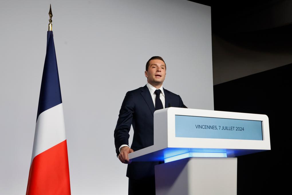7月7日,极右翼政党“国民联盟”主席若尔当·巴尔代拉出席在巴黎举行的选后集会。 新华社发(亨利·施瓦茨摄)