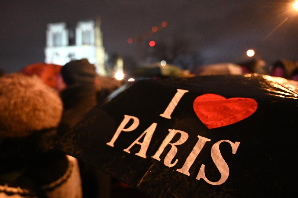12月7日,人们冒雨聚集在法国巴黎圣母院外。法国7日晚在位于塞纳河畔的巴黎圣母院举行仪式,庆祝2019年失火的巴黎圣母院经过5年修复后重新开放。新华社发(朱利安·马蒂亚摄)