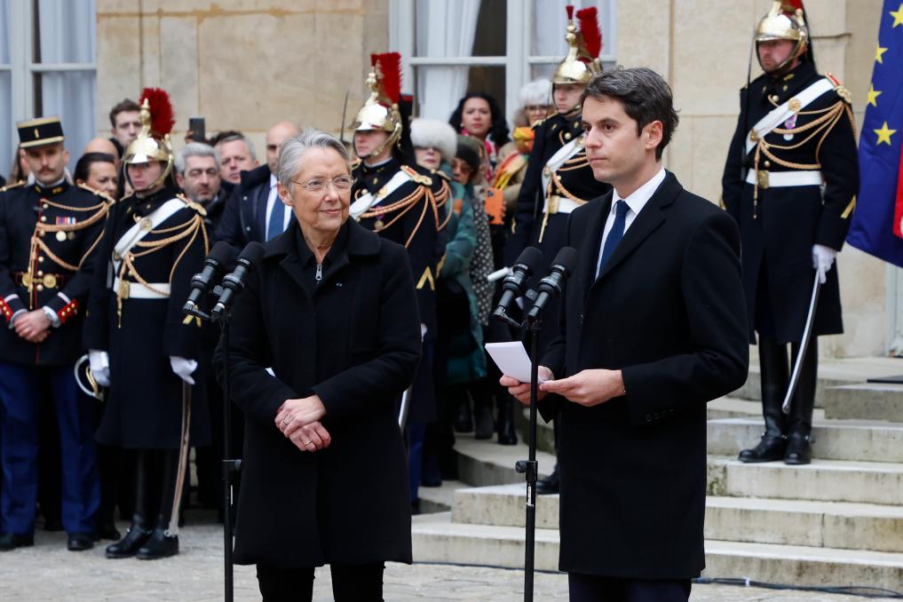 1月9日,加布里埃尔·阿塔尔(前右)在法国巴黎总理府举行的权力交接仪式上致辞。新华社发(里特·埃斯摄)