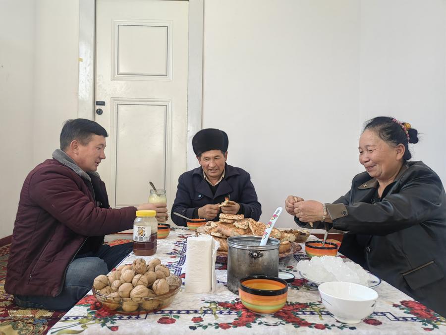 在阿合奇县库兰萨日克乡阿克特克提尔村,村民喀依拉提·斯拉木与家人在客厅席地而坐,一边聊天,一边分享美食。这次震后原址重建抗震安居房,他选择安装燃气壁挂炉采暖,还把房间全铺上地暖。“现在只要拧开煤气阀、打开壁挂炉开关,水马上变热,地上温度也逐渐上来了,和在城市生活一样便捷。”喀依拉提·斯拉木说。