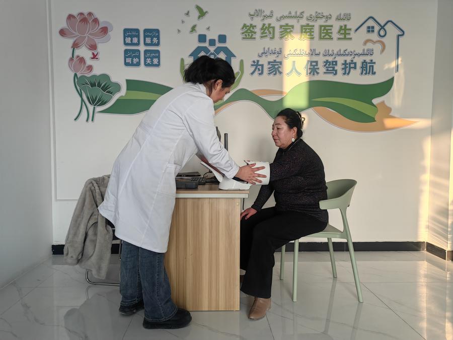 12月5日,在乌什县亚曼苏柯尔克孜族乡幸福新区卫生室,村民阿曼古丽·热合曼在测量血压。记者蔡国栋 摄