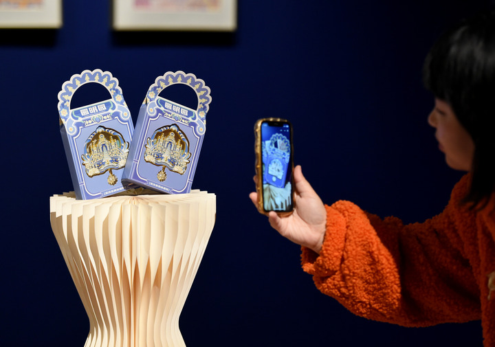 图为在2024圆明印象·皇家“游”礼文创设计展现场,观众在欣赏一款AI创意冰箱贴
