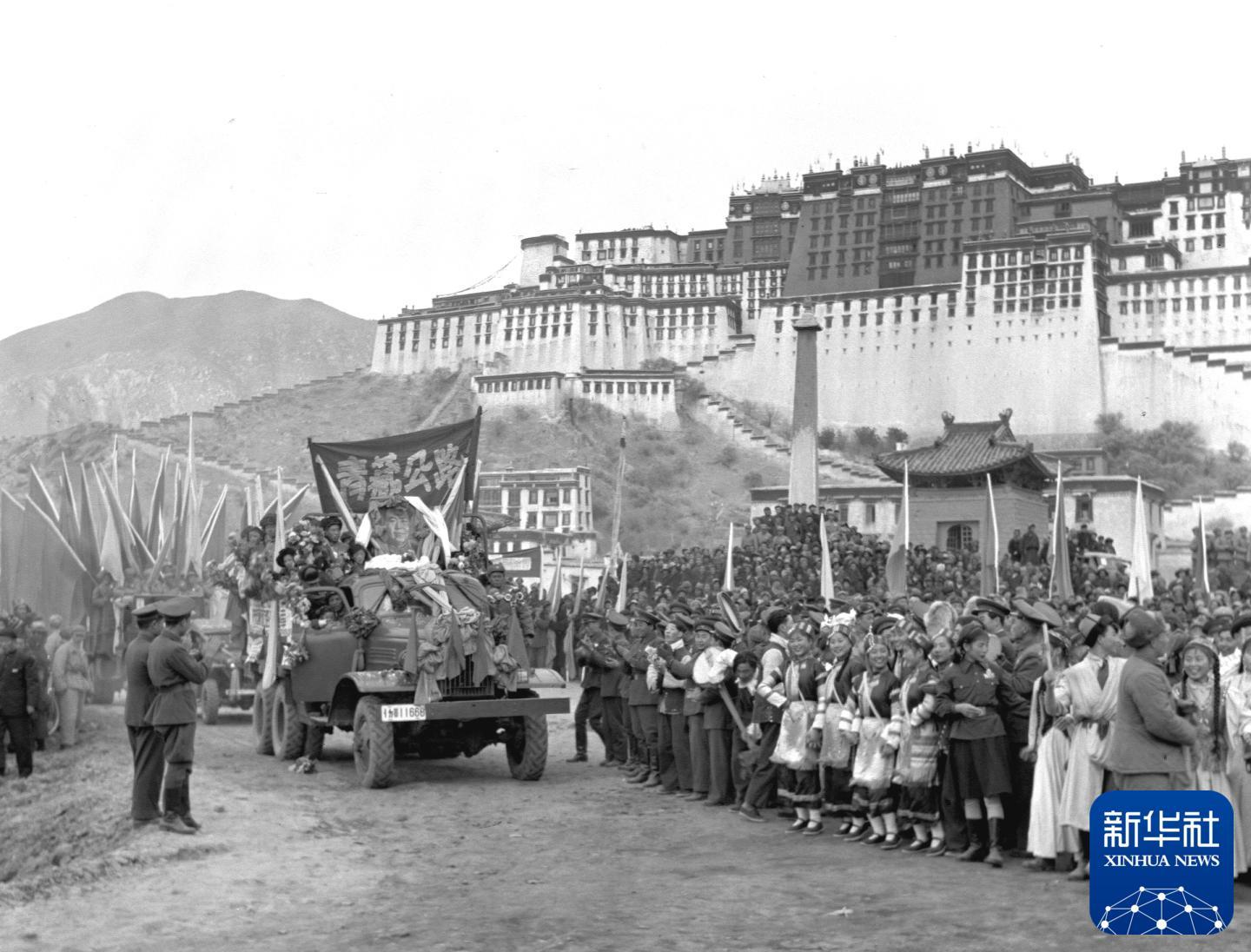 1954年12月25日,川藏公路、青藏公路同时正式通车。这是通车仪式在西藏拉萨举行。新华社发
